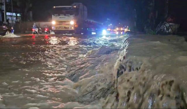 Hingga malam ini, sekitar pukul 21.30 WIB, air menggenangi badan jalan nasional sepanjang kurang lebih 500 meter dengan ketinggian mencapai 25 hingga 30 sentimeter. Kendaraan dari dua arah terpaksa melaju perlahan saat melintasi genangan.